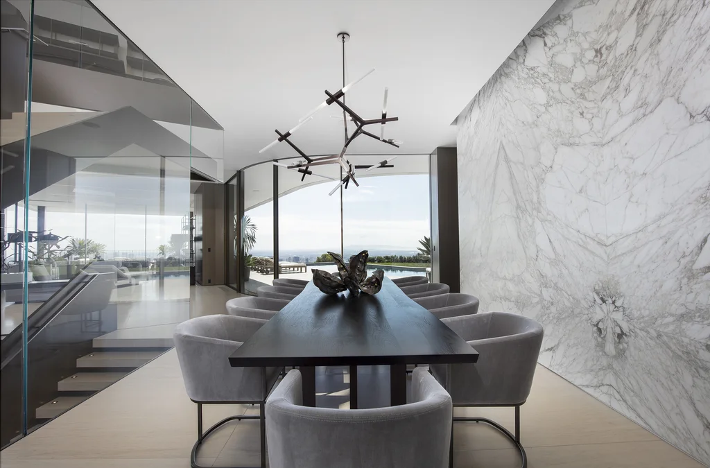 The open-plan living and dining areas are perfect for entertaining, with fluid transitions to large outdoor terraces, a sleek infinity pool, and landscaped gardens. The gourmet kitchen boasts high-end integrated appliances, custom cabinetry, and a minimalist aesthetic that reflects the home’s modern style.