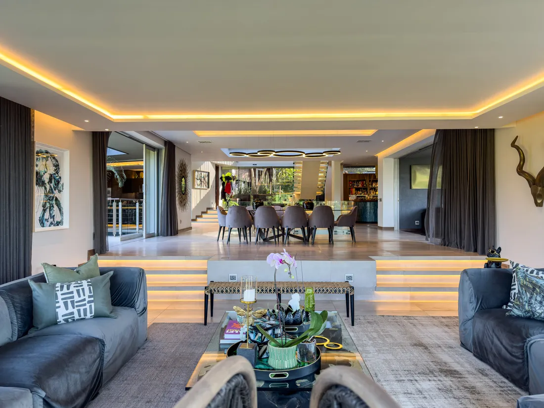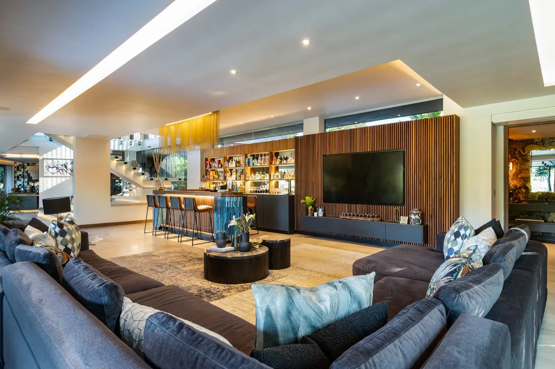 Welcome to a one-of-a-kind luxury residence, perfectly poised on the 17th fairway of Simbithiβs prestigious 18-hole executive golf course. This architectural masterpiece spans three impeccably designed levels, offering a seamless blend of refined elegance, sophisticated entertaining, and tranquil living.