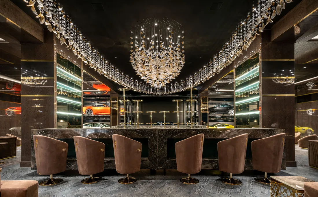 The lower level provides a 6,000-square-foot entertainment area with lofty 18-foot ceilings, custom bar, commercial-grade catering facilities, 1,000-bottle wine cellar, cigar lounge, ice-cold vodka tasting room, and a jaw-dropping automated six-car vehicle elevator display. Additional amenities on the lower level include an outdoor lounge area, luxury fitness center with rock climbing wall, spa, steam room with backlit onyx, massage room, and sound-proof cinema.