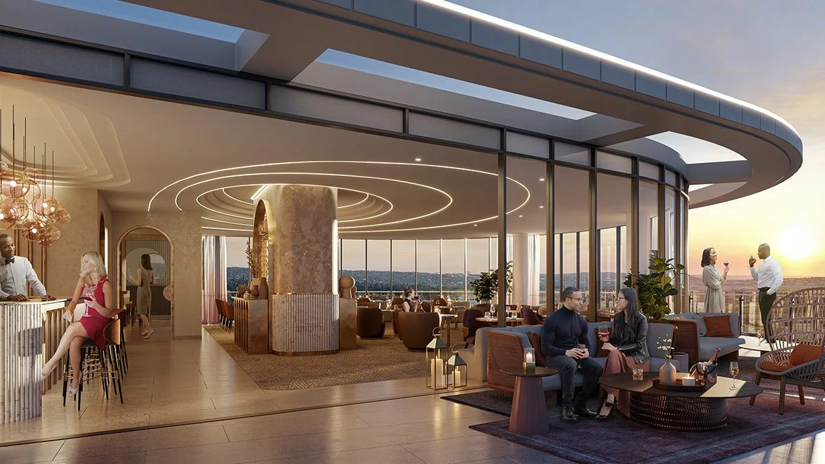 Iconic Views: Floor-to-ceiling windows frame panoramic scenes of Waterfall, Sandton, and beyond.