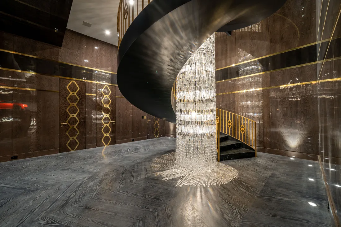 The lower level provides a 6,000-square-foot entertainment area with lofty 18-foot ceilings, custom bar, commercial-grade catering facilities, 1,000-bottle wine cellar, cigar lounge, ice-cold vodka tasting room, and a jaw-dropping automated six-car vehicle elevator display. Additional amenities on the lower level include an outdoor lounge area, luxury fitness center with rock climbing wall, spa, steam room with backlit onyx, massage room, and sound-proof cinema.